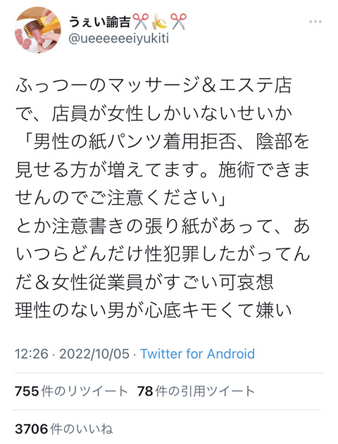【画像】Twitter民「普通のマッサージ店に行ったら衝撃を受けた。理性のない男、まじキモイ。」←話題にWWWWWWWWWWWWWW Twitter Facebook はてブ LINE コピー 2022.10.08 スポンサーリンク 1:くーるびゅー:[ここ壊れてます] .net 6:以下、?ちゃんねるからVIPがお送りします:[ここ壊れてます] .net そういうAV見ちゃうからねー 勘違いしちゃうんだよねー 続きを読む