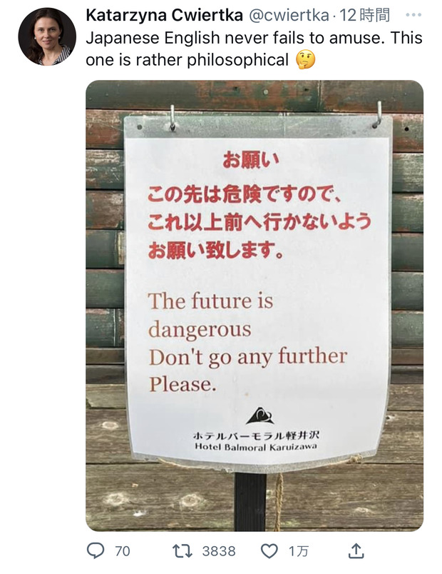 軽井沢の看板「この先は危険です(The future is dangerous)」⇒哲学的だと海外で話題に Twitter Facebook はてブ LINE コピー 2022.10.10 スポンサーリンク 1:2022/10/10(月) 20:29:18.37 ID:8WJRxkbl0転載元スレッド:https://hayabusa9.5ch.net/test/read.cgi/news/1665401358/ 続きを読む