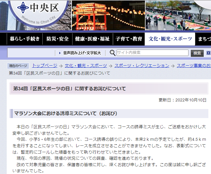 東京都中央区で10日、「スポーツの日」に合わせて開かれた区民マラソン大会で、2キロのコースを走ることになっていた小学生参加者のうち5、6年生の男女約130人が誘導スタッフのミスで倍以上の4・5キロを走らされるアクシデントがあった。区は同日、ミスを認めてホームページで謝罪した。
