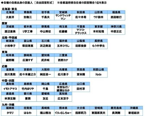 一方、芸能人を多く輩出する東京都は「木村拓哉さん」、神奈川県は「中居正広さん」、大阪府は「岡田准一さん」、福岡県は「タモリさん」、兵庫県は「北川景子さん」、沖縄県は「新垣結衣さん」が1位に。また石川県は「浜辺美波さん」、静岡県は「広瀬すずさん」と人気女優が自慢したいNo.1のほか、広島県は「有吉弘行さん」と「綾瀬はるかさん」の2人が顔を並べており、佐賀県では実際には佐賀が出身地ではない「はなわさん」が1位になっていました。