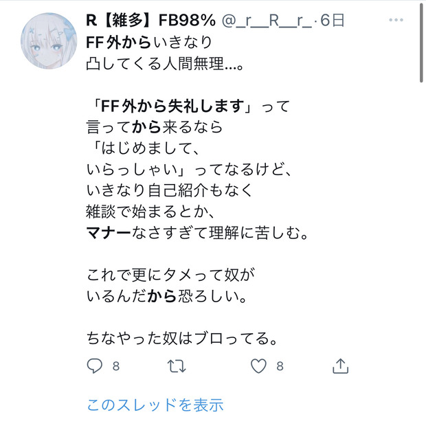 Twitter特有の謎マナーを強制したがるTwitter民www Twitter Facebook はてブ LINE コピー 2022.10.11 スポンサーリンク 1 : 風吹けば名無し :2022/10/11(火) 13:00:56.32 ID:KRy+RzWn0FF外から失礼しますを強制しようとしてる奴いたわTwitterやめればいいのに転載元スレッド:https://eagle.5ch.net/test/read.cgi/livejupiter/1665460856/ 続きを読む