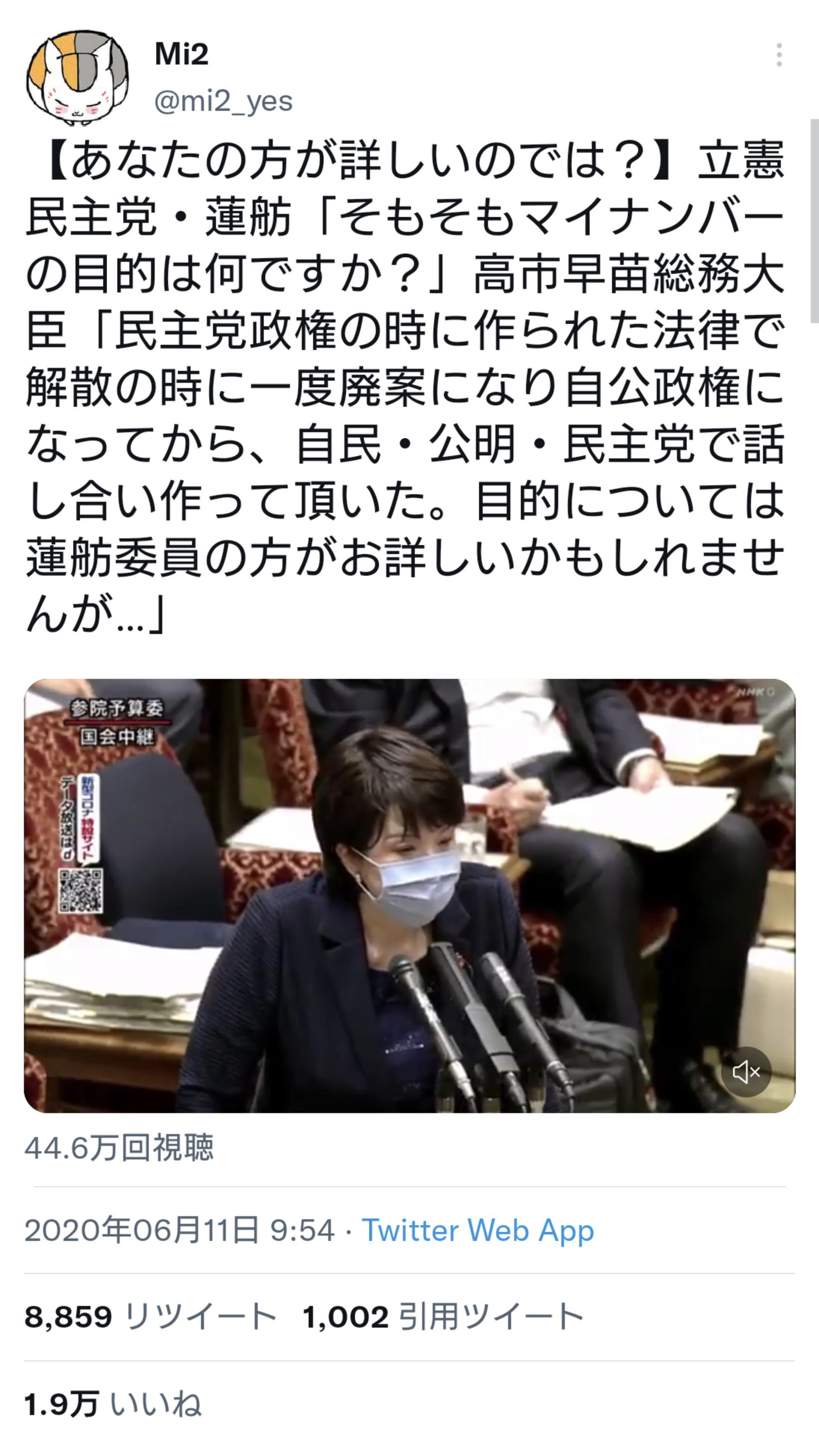 蓮舫「マイナンバーの目的は?」 高市「民主党政権で作られた。あなたの方が詳しいのでは」 蓮舫「」 Twitter Facebook はてブ LINE コピー 2022.10.13 スポンサーリンク 1:2022/10/13(木) 08:46:13.79 ID:dVZ7piev0独自】紙の健康保険証24年秋に原則廃止、マイナンバーカード事実上義務化へ あさって政府発表https://news.yahoo.co.jp/articles/4dffe621be32bf71683543b21784c17436e48f58転載元スレッド:https://hayabusa9.5ch.net/test/read.cgi/news/1665618373/ 続きを読む