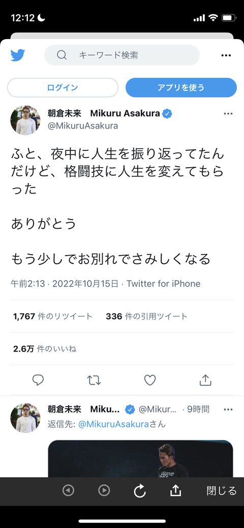 【悲報】朝倉未来さん、突然の引退宣言!その裏にはとんでもない理由が!w Twitter Facebook はてブ LINE コピー 2022.10.15 スポンサーリンク 1:風吹けば名無し:2022/10/15(土) 12:14:55.15 ID:iCCXpa5eM.net 昨夜、突如引退宣言 ↓ 前日に宿敵クレベルが朝倉未来を指名 2:風吹けば名無し:2022/10/15(土) 12:15:24.25 ID:bp4UUCsV0.net かわいそう 3:風吹けば名無し:2022/10/15(土) 12:15:41.70 ID:7xOnEPzp0.net もう乳首でいくのは嫌なの 5:風吹けば名無し:2022/10/15(土) 12:16:48.06 ID:nRAXZ2NJd.net 二度目は流石に言い訳きかないもんな 続きを読む