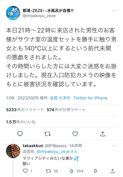 — 都湯-ZEZE-♨︎水風呂が自慢‼︎ (@miyakoyu_zeze) October 14, 2022