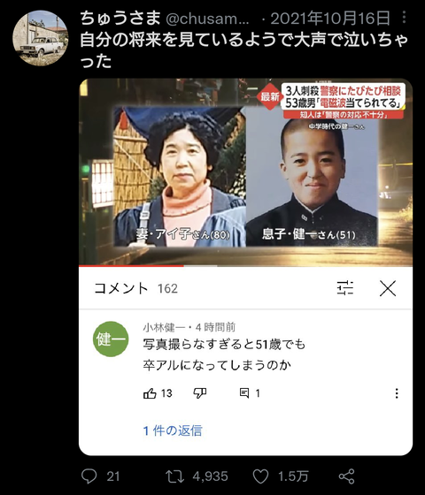 【画像】Twitter民「自分の将来を見ているようで大声で泣いちゃった」←2万いいね Twitter Facebook はてブ LINE コピー 2022.10.16 スポンサーリンク 1:風吹けば名無し:2022/10/16(日) 22:38:37.77 ID:p2QQhLut0.net 2:風吹けば名無し:2022/10/16(日) 22:40:15.10 ID:4K3V63ZE0.net ワイもなんか泣いちゃった 3:風吹けば名無し:2022/10/16(日) 22:40:28.05 ID:D25nKitm0.net 普通に51歳のときの写真だろ 続きを読む