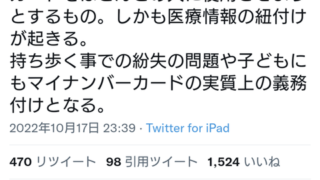 マイナンバーカードをほとんどの人に使用させようとするもの。しかも医療情報の紐付けが起きる。