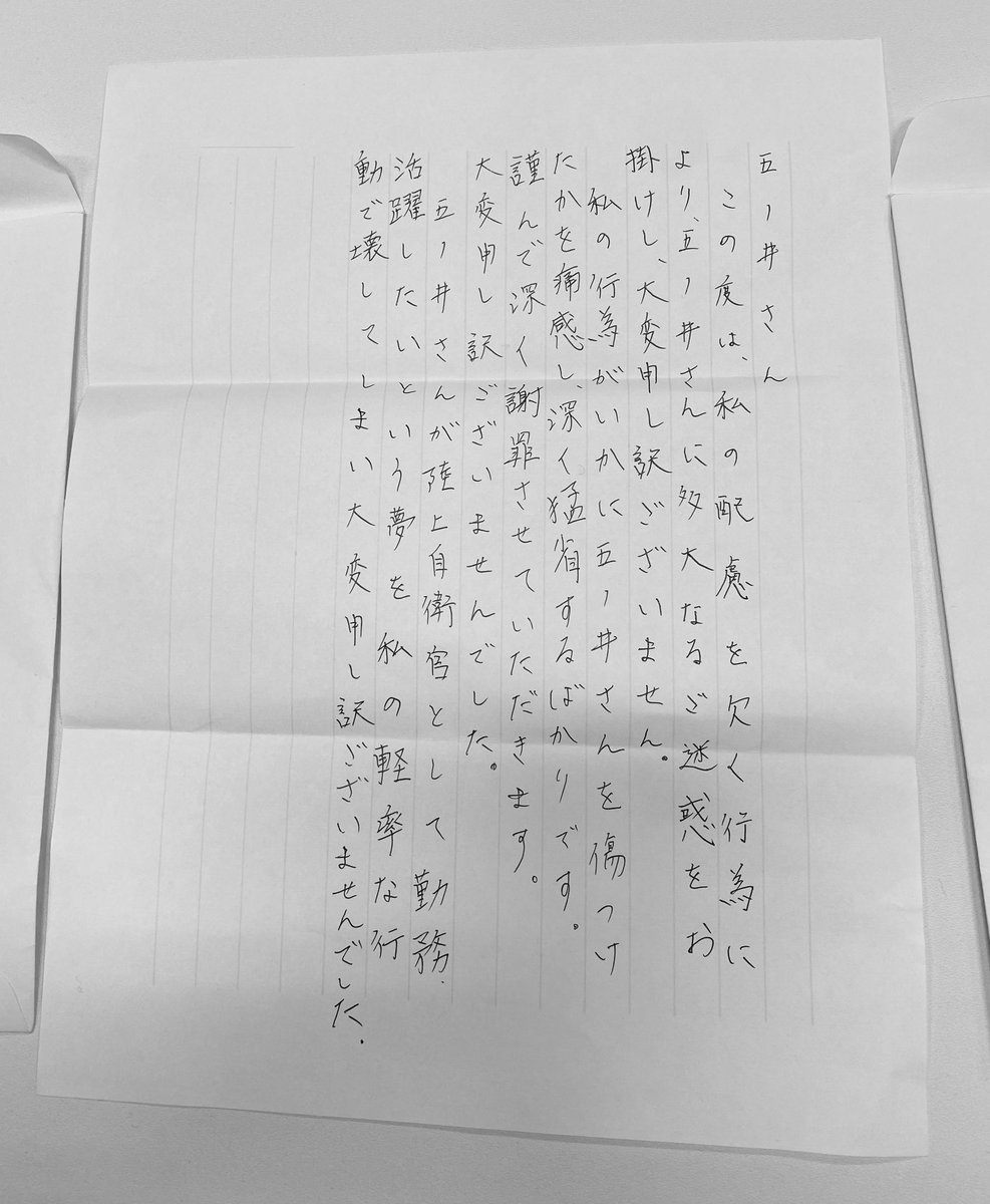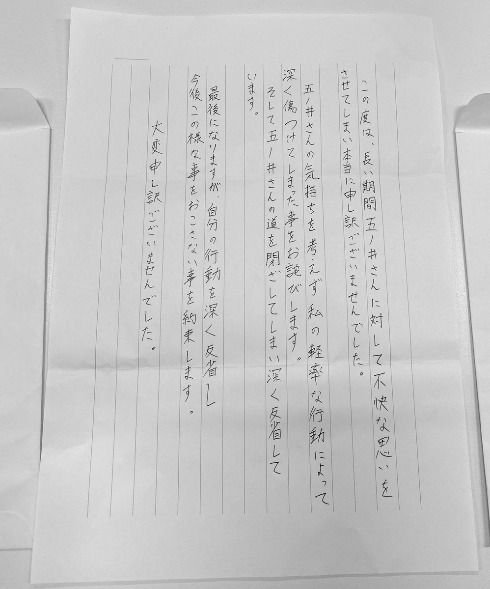 本日、やっとの思いで加害者4名から直接、謝罪と手紙を受けました。個別で一人ずつ対面し、しっかり本人達が事実を認め謝罪。私は今まで加害者からの直接謝罪を目的として活動してきたので、対面は怖くありませんでした。一年が過ぎ本当に遅い謝罪でしたが、ようやく実現しました。(続) pic.twitter.com/mw3upfkn2Y