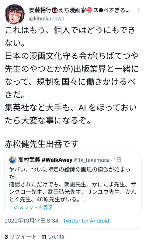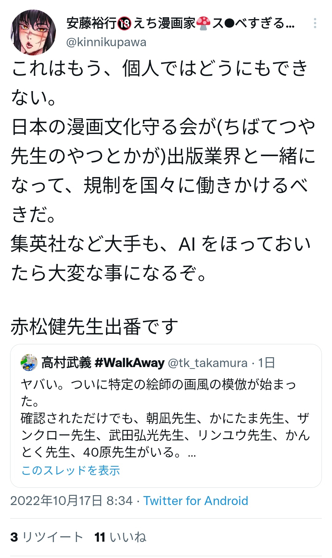 【画像】絵師「AI絵師は国が規制をかけるべき」 Twitter Facebook はてブ LINE コピー 2022.10.19 スポンサーリンク 1:以下、?ちゃんねるからVIPがお送りします:[ここ壊れてます] .net 2:ちくわ:[ここ壊れてます] .net あの人って容認しそう 厳罰化されそうになってるところにやりすぎだよって助言した人だよね 3:以下、?ちゃんねるからVIPがお送りします:[ここ壊れてます] .net 世界レベルで規制しないと意味ないよ 続きを読む