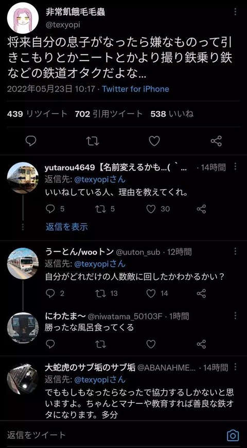 【悲報】まんさん「息子が撮り鉄になるとかニートより嫌!」無事大炎上してしまうwwwwwwwwww Twitter Facebook はてブ LINE コピー 2022.10.20 スポンサーリンク 1:風吹けば名無し:2022/10/20(木) 11:52:31.71 ID:UqGDHizE0.net 2:風吹けば名無し:2022/10/20(木) 11:53:20.53 ID:Xsridey1r.net 予想通りのシュッポシュポで草 5:風吹けば名無し:2022/10/20(木) 11:54:22.29 ID:PYWPoCnm0.net 電車がしゃべってて草 続きを読む