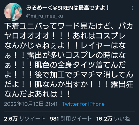 下着ユニバってワード見たけど、バカヤロオオオオ!!!あれはコスプレなんかじゃねぇよ!!レイヤーはなぁ!!露出が多いコスプレの時はなぁ!!!肌色の全身タイツ着てんだよ!!!後で加工でチマチマ消してんだよ!!肌なんか出すか!!!露出狂なんだよあれは!!