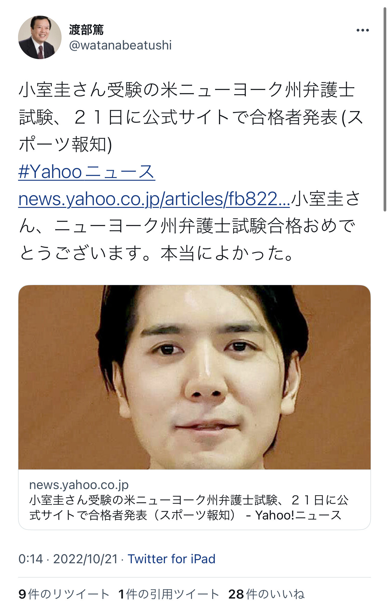 【超速報】小室圭さん、ガチで合格!! Twitter Facebook はてブ LINE コピー 2022.10.21 スポンサーリンク 1:2022/10/21(金) 02:20:33.45 ID:LwqXatO50やったぜ転載元スレッド:https://eagle.5ch.net/test/read.cgi/livejupiter/1666286433/ 続きを読む
