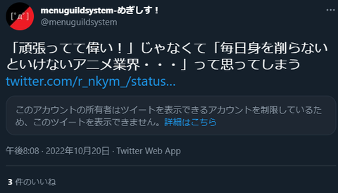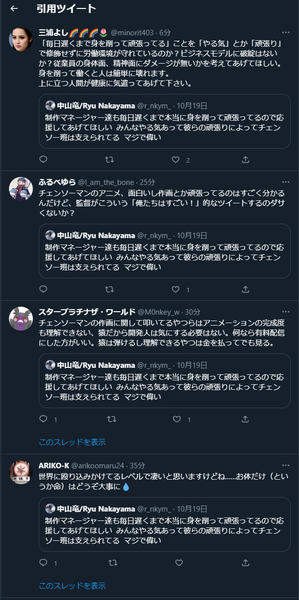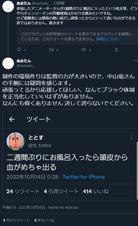 【悲報】チェンソーマンの監督、批判ツイートをブロックしまくってる模様wwwwwwwwwww Twitter Facebook はてブ LINE コピー 2022.10.21 スポンサーリンク 1:風吹けば名無し:2022/10/21(金) 20:33:42.35 正論言われてブロックていくらなんでもダサすぎやろ なおまだ叩かれてる模様 https://twitter.com/r_nkym_/status/1582469072360738816 (deleted an unsolicited ad) 2:風吹けば名無し:2022/10/21(金) 20:34:06.71 こんな監督でええんか 続きを読む