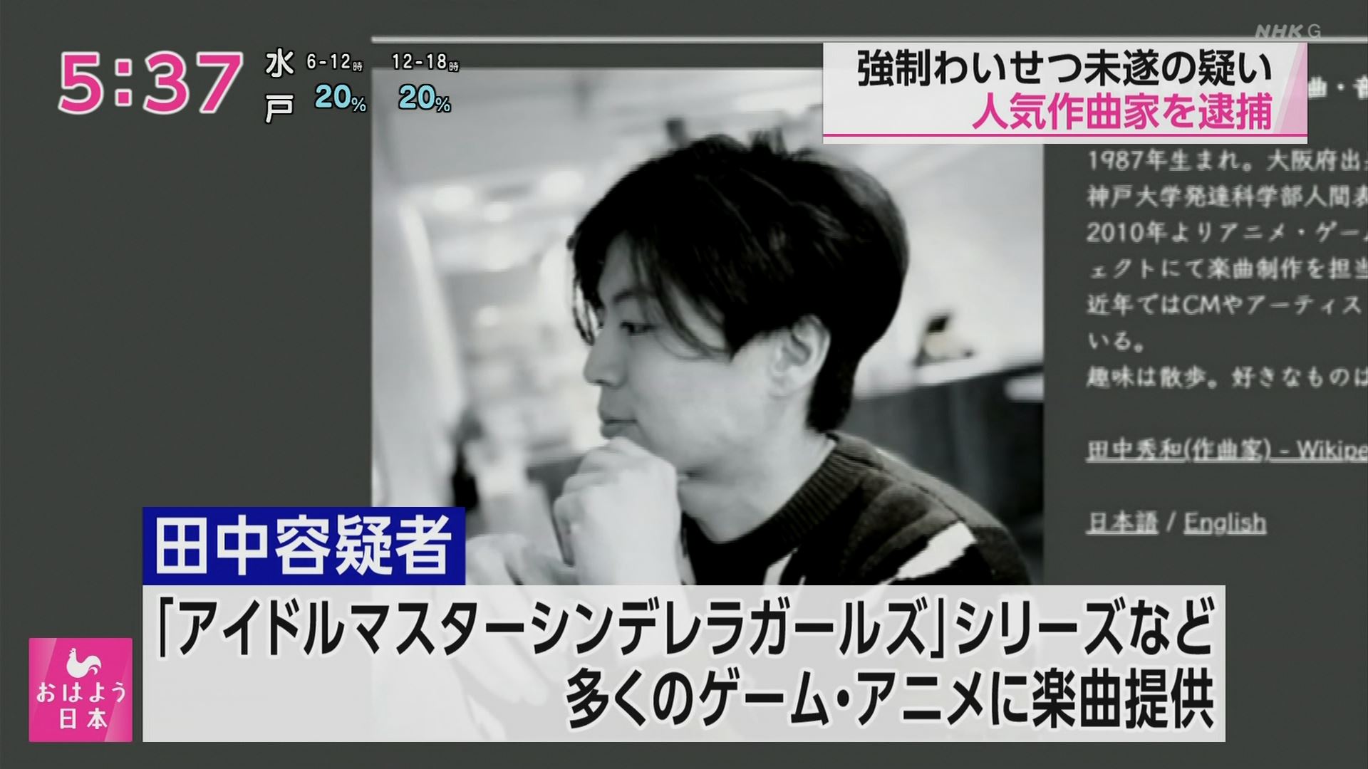 本人のホームページなどによりますと、田中容疑者は人気ゲーム「アイドルマスターシンデレラガールズ」シリーズの音楽を担当するなど、数多くのゲームやアニメに楽曲を提供しています。