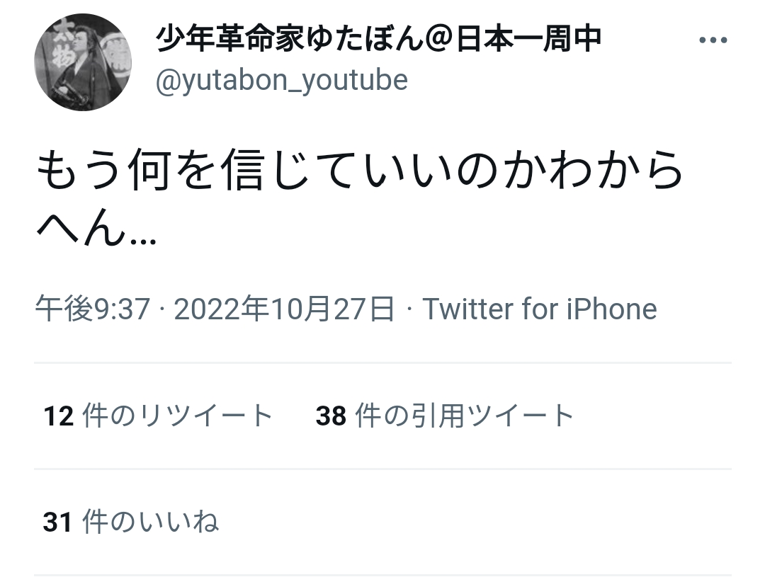 少年革命家ゆたぼん(13)「もう誰を信じていいのか分からへん…」 Twitter Facebook はてブ LINE コピー 2022.10.28 スポンサーリンク 1: それでも動く名無し 2022/10/28(金) 09:56:43.28 ID:a3UVwttb0 https://twitter.com/yutabon_youtube/status/1585611660689305600 4: それでも動く名無し 2022/10/28(金) 09:57:17.85 ID:a3UVwttb0 どうすんのこれ? 6: それでも動く名無し 2022/10/28(金) 09:57:51.46 ID:a/VO9iT/a まさかパパの呪縛から逃れようとしてんのか!? 続きを読む