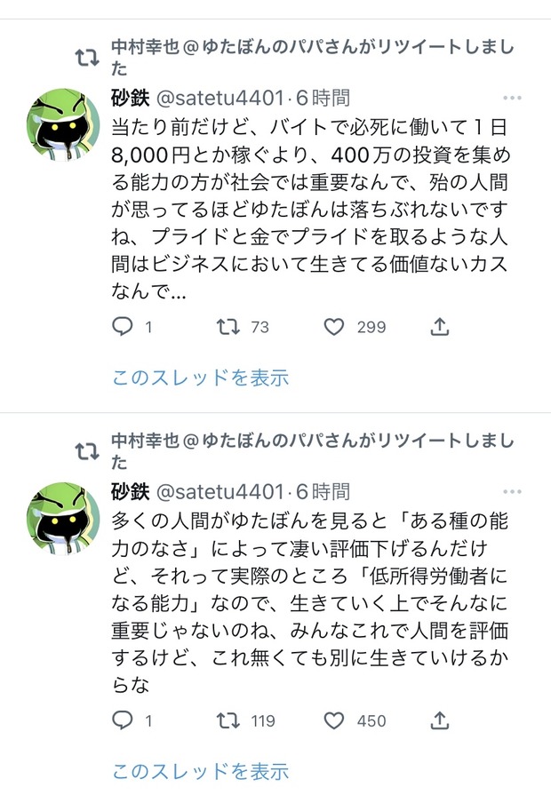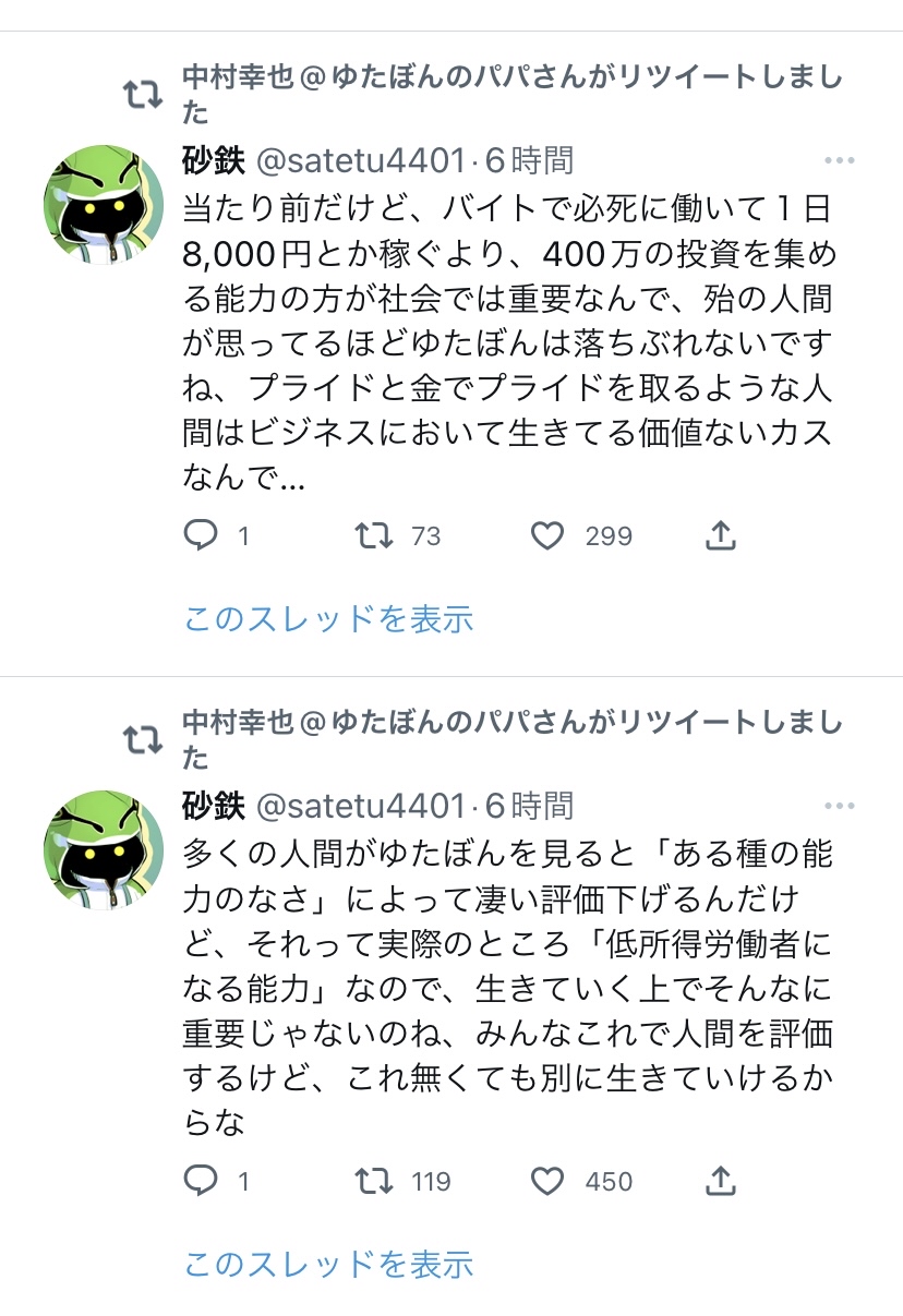 識者「1日8000円稼ぐアンチより400万の投資を集めるゆたんぽの方が社会にとって重要」 Twitter Facebook はてブ LINE コピー 2022.10.30 スポンサーリンク 1:2022/10/30(日) 19:06:21.04 ID:gUT4IpCaa転載元スレッド:https://eagle.5ch.net/test/read.cgi/livejupiter/1667124381/ 続きを読む