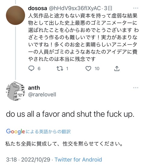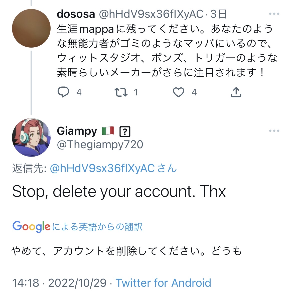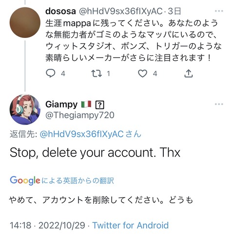 【画像】チェンソーマンの監督のTwitterのリプ欄ひどくてワロタwwwwwwwwwwwwwwwwwwwwwwwwwwwwww Twitter Facebook はてブ LINE コピー 2022.10.31 スポンサーリンク 1:以下、?ちゃんねるからVIPがお送りします:2022/10/30(日) 08:00:25.967 叩きたい日本人vs必死に擁護する外人の抗争が起きてる 2:以下、?ちゃんねるからVIPがお送りします:2022/10/30(日) 08:00:49.686 醜いね 続きを読む