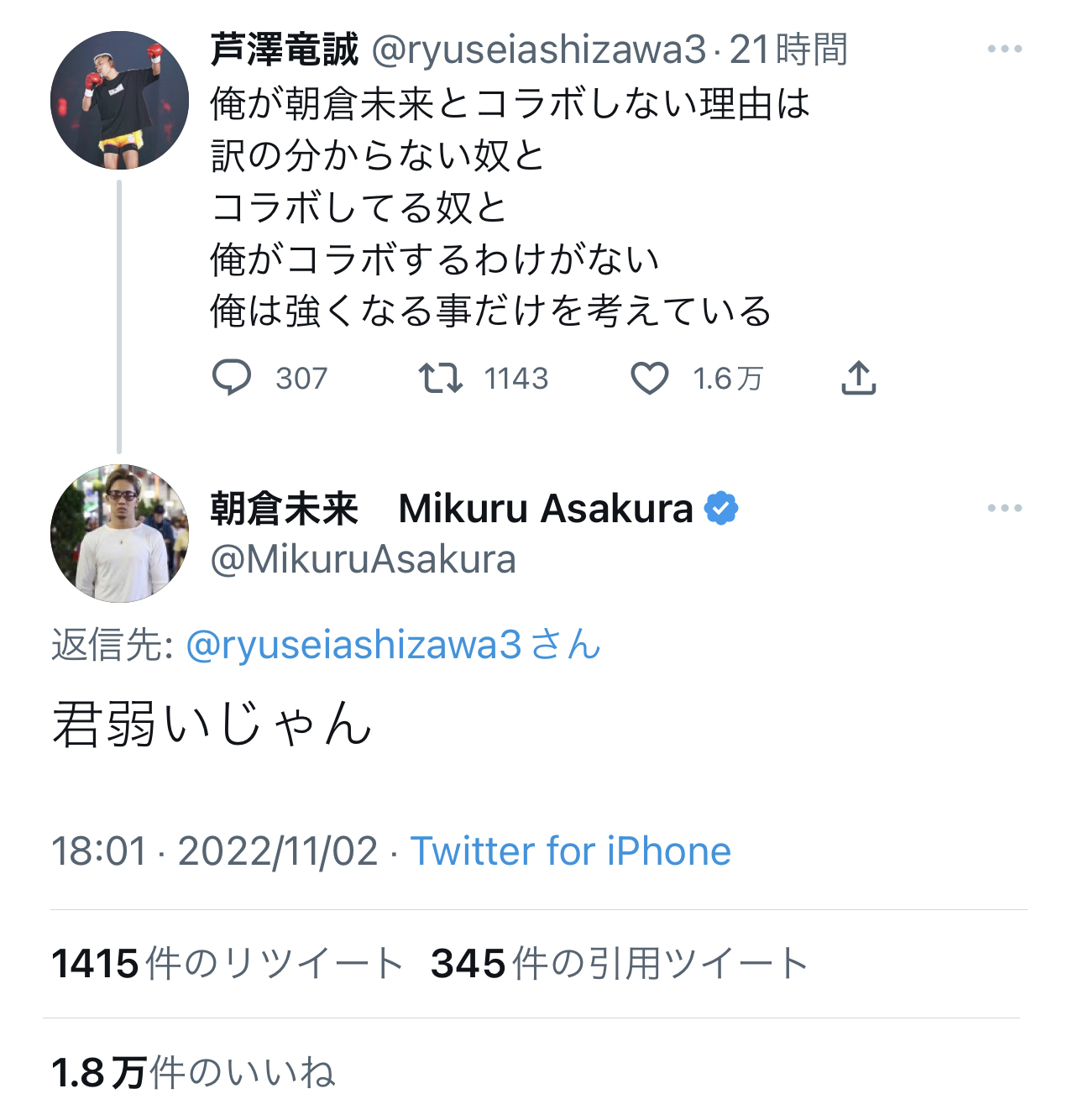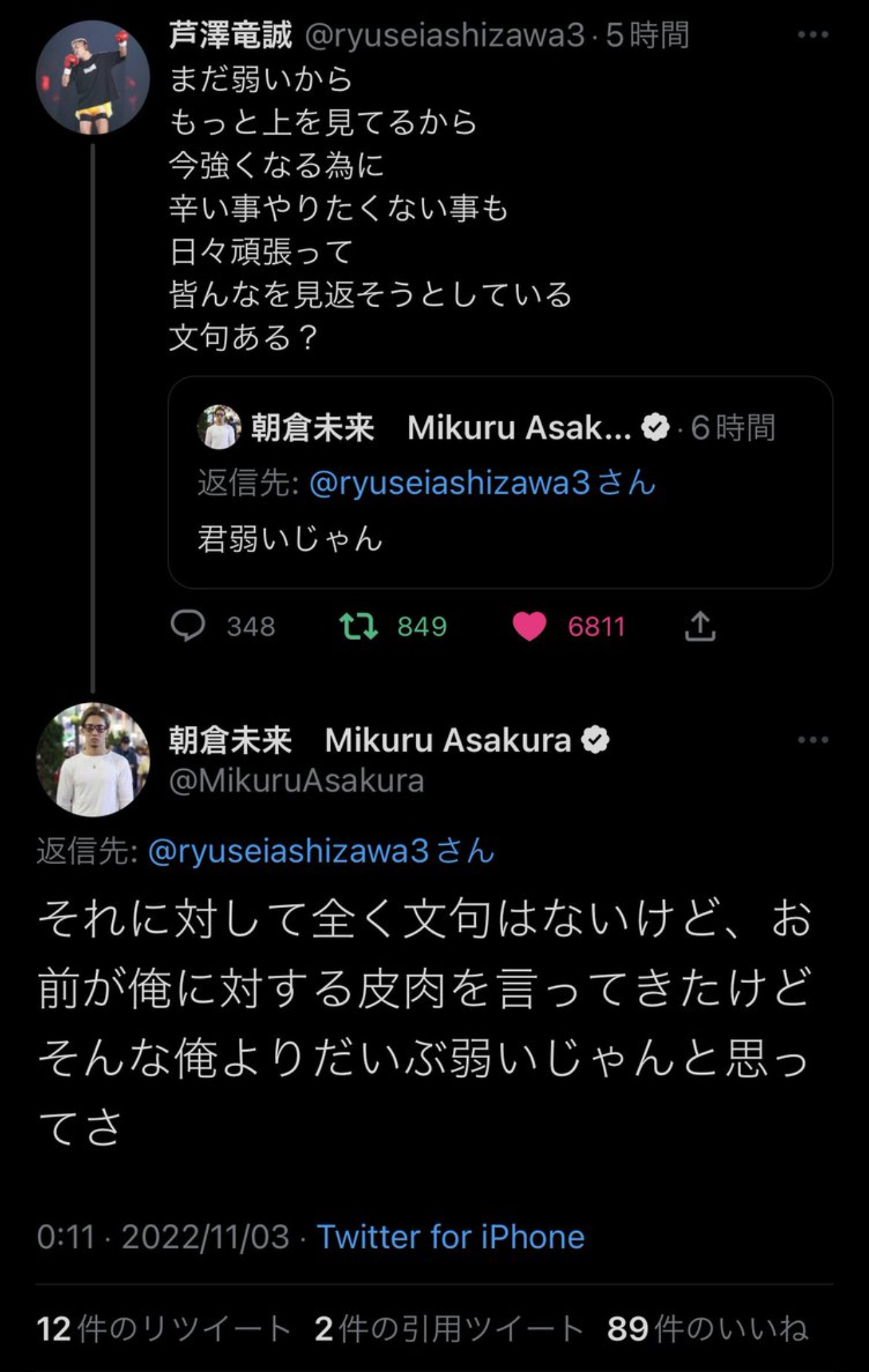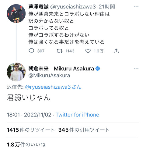 【悲報】朝倉未来さん、K-1選手に論破されメンタルボロボロ Twitter Facebook はてブ LINE コピー 2022.11.03 スポンサーリンク 1:風吹けば名無し:2022/11/03(木) 15:22:21.02 ID:nrv7G2Qn0.net 論破された後ツイート削除した模様 2:風吹けば名無し:2022/11/03(木) 15:23:15.59 ID:0T8qSkYc0.net KOされてて草 4:風吹けば名無し:2022/11/03(木) 15:23:59.20 ID:ktALJVtX0.net 震えながらツイートしてそう 続きを読む