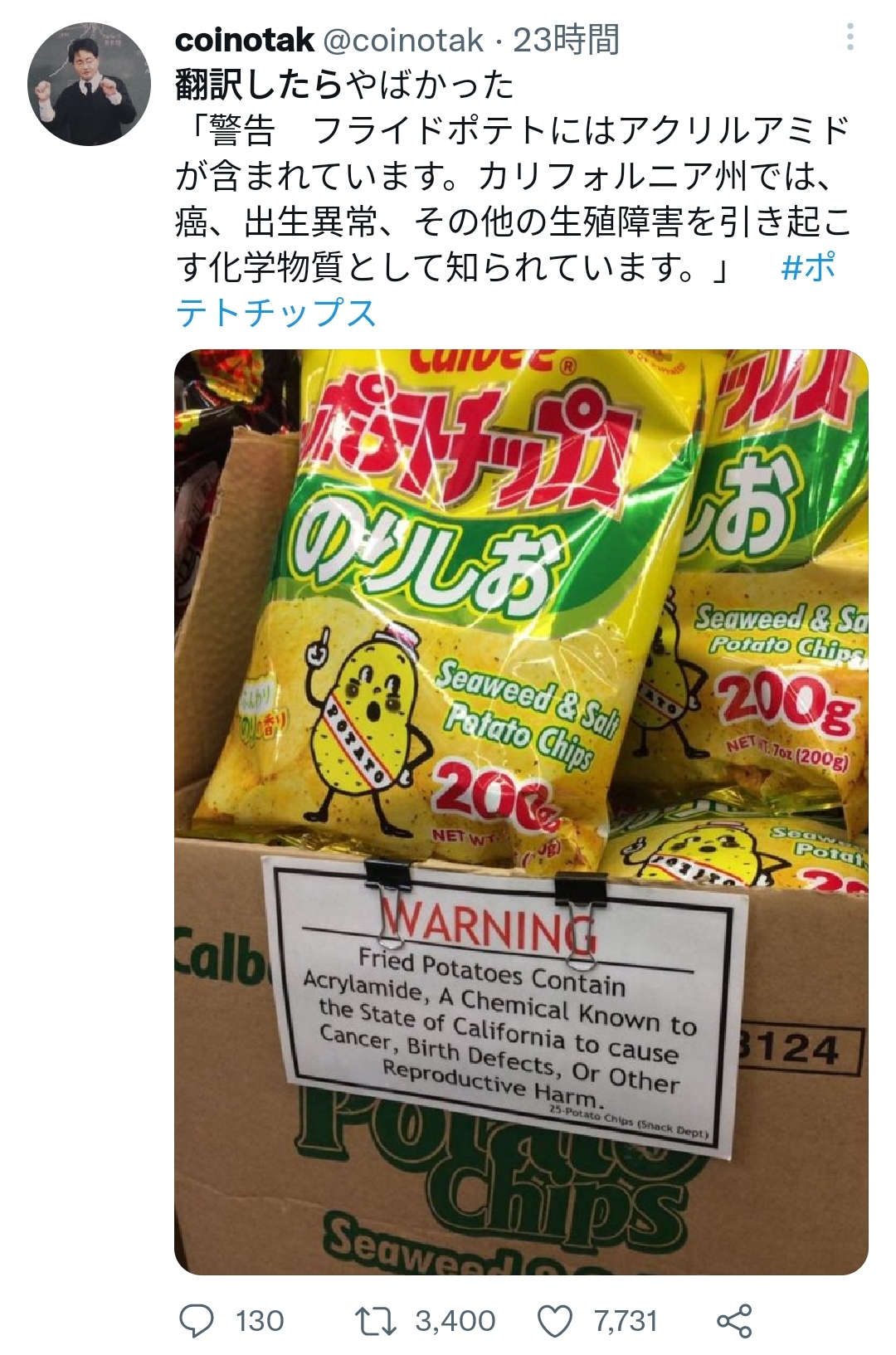 「警告 フライドポテトにはアクリルアミドが含まれています。カリフォルニア州では、癌、出生異常、その他の生殖障害を引き起こす化学物質として知られています。」 #ポテトチップス pic.twitter.com/FCHH1Tlf86
