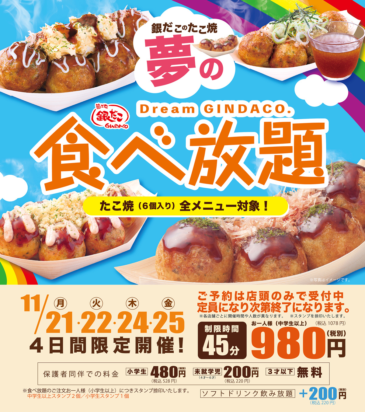 銀だこ食べ放題980円とか最高かよ…大阪なくて号泣😭11月21日から25日は皆んなイオンに集合!! pic.twitter.com/A9PBfwsUIG