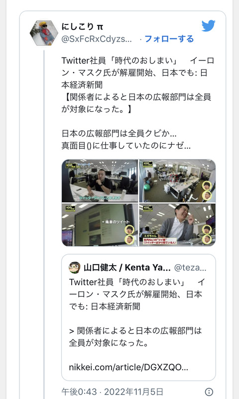【悲報】Twitterさん、日本の広報担当社員を全てクビにしていた Twitter Facebook はてブ LINE コピー 2022.11.07 スポンサーリンク 1:風吹けば名無し:2022/11/07(月) 07:28:00.84 ID:m+YJLuWLd.net 残当やね… 続きを読む