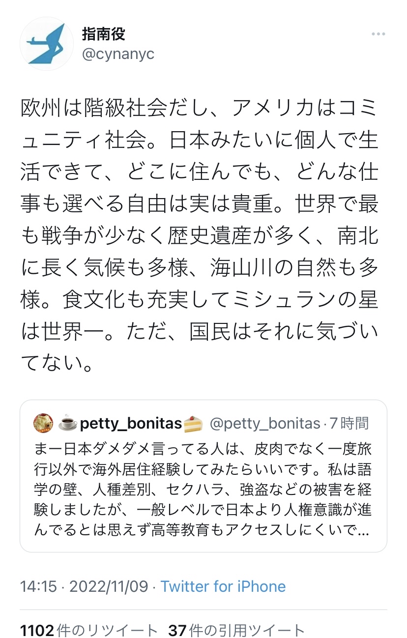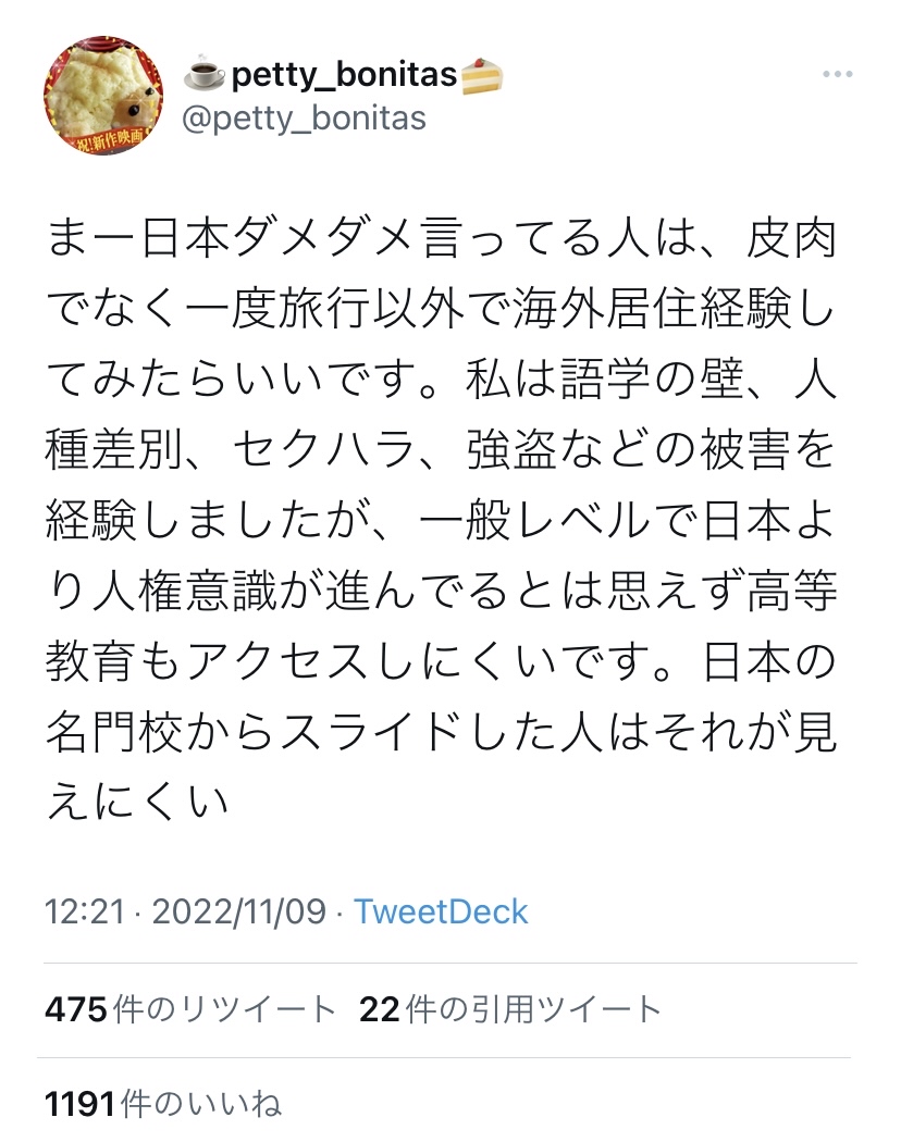 まー日本ダメダメ言ってる人は、皮肉でなく一度旅行以外で海外居住経験してみたらいいです。私は語学の壁、人種差別、セクハラ、強盗などの被害を経験しましたが、一般レベルで日本より人権意識が進んでるとは思えず高等教育もアクセスしにくいです。日本の名門校からスライドした人はそれが見えにくい