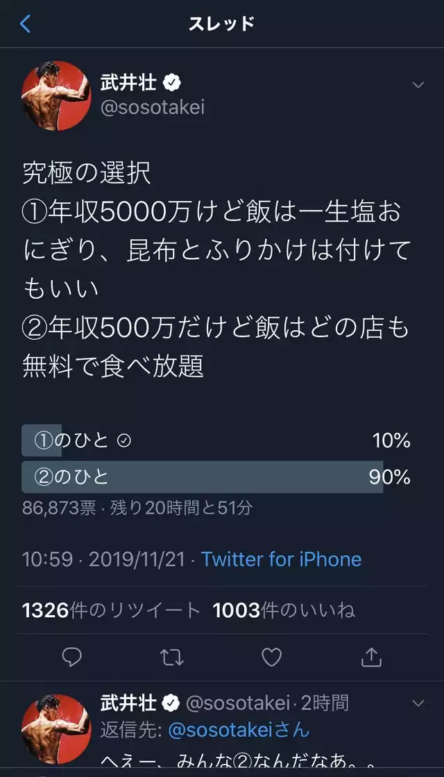 武井壮さん「①年収5000万で一生塩おむすびか②年収500万で一生全店無料食べ放題かなら?」 Twitter Facebook はてブ LINE コピー 2022.11.10 スポンサーリンク 1 : 風吹けば名無し :2022/11/10(木) 05:57:56.24 ID:ecigXdHqpへえー、みんな②なんだなあ。。オレが今学生なら、10年①で塩むすびを様々な美味しいふりかけと昆布で味わい尽くして5億貯めといてそのあとビジネスやレジャーを存分に楽しみつつ美食を堪能するけどなあ。。2 : 風吹けば名無し :2022/11/10(木) 05:58:07.92 ID:ecigXdHqp3 : 風吹けば名無し :2022/11/10(木) 05:59:04.71 ID:l2NW77Eh0一生とは転載元スレッド:https://eagle.5ch.net/test/read.cgi/livejupiter/1668027476/ 続きを読む