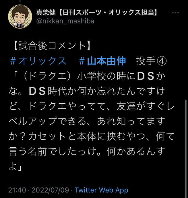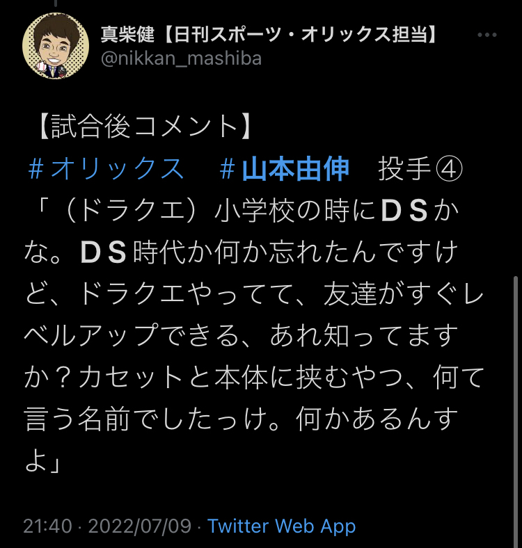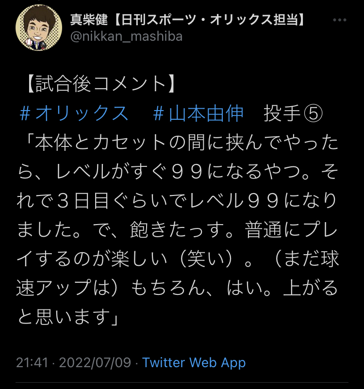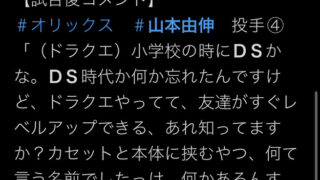 オリックス山本由伸「ドラクエですぐレベルアップ出来るやつ知ってます?カセットと本体に挟むやつ」