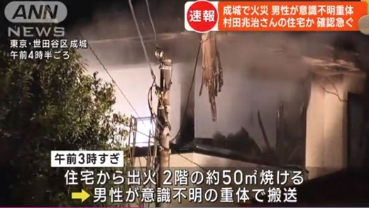 11日午前3時15分頃、東京都世田谷区成城、プロ野球・ロッテ元投手の村田兆治さん(72)方から出火、木造2階建て住宅の2階部分約40平方メートルが焼け、室内から村田さんが救助されたが、搬送先の病院で間もなく死亡が確認された。警視庁成城署が出火原因を調べている。