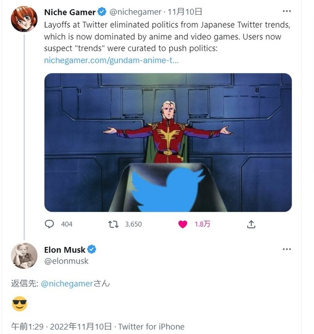 ツイッタージャパンがトレンド操作してパヨク政治ワードをゴリ押ししてた疑惑、イーロンマスクにバレる Twitter Facebook はてブ LINE コピー 2022.11.11 スポンサーリンク 1:2022/11/11(金) 16:19:29.56 ID:P1YIr8NC0😎— Elon Musk (@elonmusk) November 9, 2022(DeepL翻訳 Twitter社のレイオフにより、日本のTwitterトレンドから政治が排除され、アニメやゲームが主流となった。ユーザーは、「トレンド」が政治を推し進めるためにキュレーションされたのではないかと思うようになった。)Elon Musk@elonmusk😎転載元スレッド:https://hayabusa9.5ch.net/test/read.cgi/news/1668151169/ 続きを読む