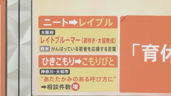 「ニート」について、大阪府では「レイブル」と呼ぶように推奨。「レイブル」は「レイト・ブルーマー」=「遅咲き・大器晩成」という意味があるという。