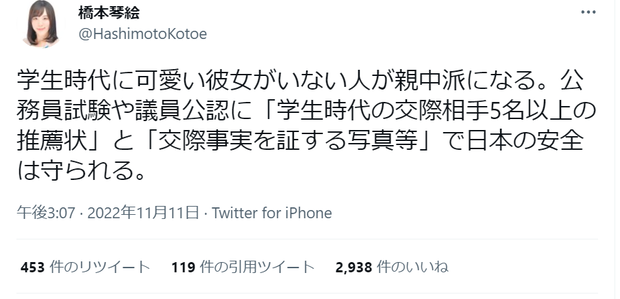 学生時代に可愛い彼女がいない人が親中派になる。公務員試験や議員公認に「学生時代の交際相手5名以上の推薦状」と「交際事実を証する写真等」で日本の安全は守られる。