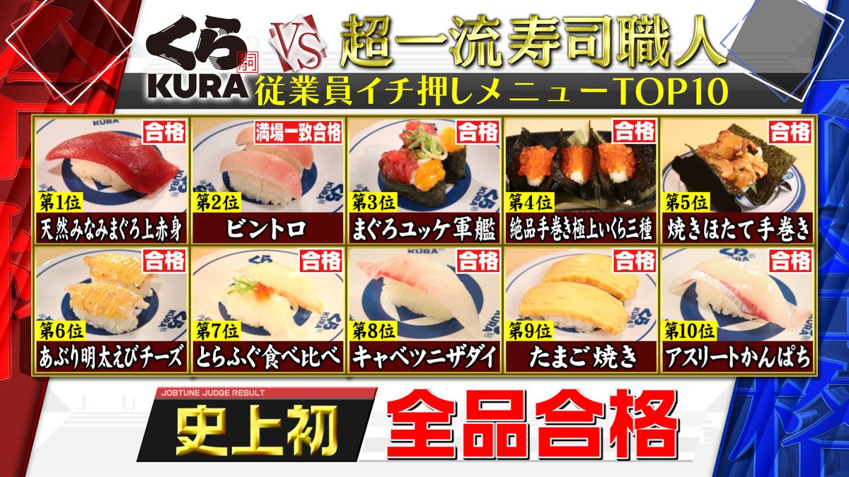 TBS系『#ジョブチューン ☆』で #くら寿司 が史上初の #全商品合格 です!