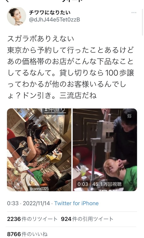 【動画】食べログ4.58の高級レストランさん、客の顔面にモンブランをぶっかけて炎上中 Twitter Facebook はてブ LINE コピー 2022.11.14 スポンサーリンク 1:風吹けば名無し:2022/11/14(月) 19:42:59.93 ID:vvHXTsO80.net https://s.tabelog.com/tokyo/A1307/A130704/13182678/ 動画は>>2 続きを読む