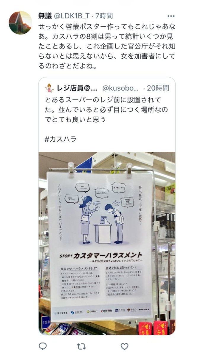 【悲報】『カスハラやめましょう!』啓蒙ポスター、なぜかリアルタイムで絶賛炎上中wwwwwwww Twitter Facebook はてブ LINE コピー 2022.11.15 スポンサーリンク 1:ミラノ作 どどんスズスロウン(東京都) [US]:2022/11/14(月) 22:37:40.52 ID:hRYiRP/k0 BE:227847468-2BP(1500) 2:チキンウィングフェースロック(静岡県) [US]:2022/11/14(月) 22:38:42.72 ID:clUf3sB80 ギャーギャー騒ぐのは大抵ババアだろ 10:パロスペシャル(埼玉県) [EU]:2022/11/14(月) 22:41:26.11 ID:9dylLPUx0 >>2 大抵ジジイだぞ 3:ミラノ作 どどんスズスロウン(東京都) [US]:2022/11/14(月) 22:38:51.72 ID:hRYiRP/k0 4:ダイビングフットスタンプ(大阪府) [US]:2022/11/14(月) 22:38:59.77 ID:mwc+XWUH0 はい見た目で性別を決める時代遅れのアホ 続きを読む