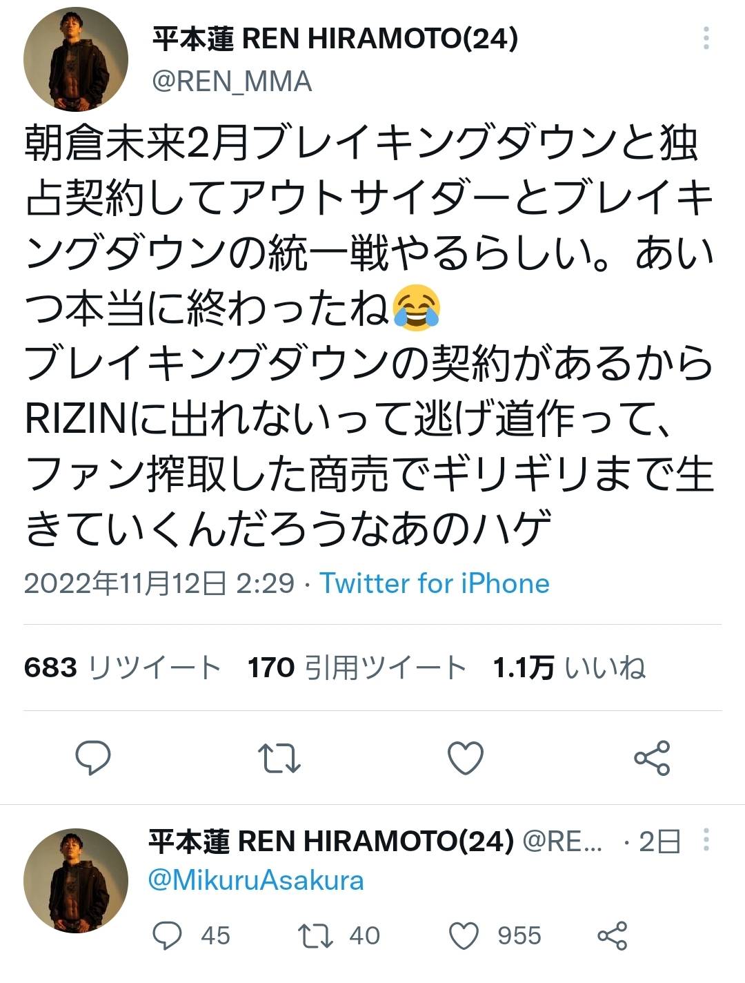 【悲報】平本蓮さん「朝倉未来はRIZINから逃げまくって終わってるハゲ」 Twitter Facebook はてブ LINE コピー 2022.11.15 スポンサーリンク 1: それでも動く名無し 2022/11/14(月) 14:57:45.12 ID:0zxo3Wsy0 https://twitter.com/REN_MMA/status/1591120863898005504 2: それでも動く名無し 2022/11/14(月) 14:58:12.86 ID:0zxo3Wsy0 言い過ぎやろ… 32: それでも動く名無し 2022/11/14(月) 15:07:09.83 ID:BAFJTlAEd ハゲは容赦なさすぎやろ これのせいでみんな髪ばっか集中して見るやん 続きを読む