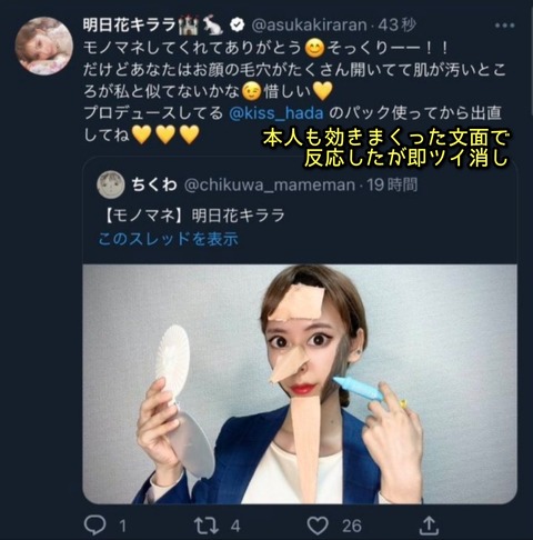 【悲報】明日花キララ、自分のモノマネをしたYouTuberにブチギレてしまうwwwwww Twitter Facebook はてブ LINE コピー 2022.11.16 スポンサーリンク 1:以下、5ちゃんねるからVIPがお送りします:2022/11/15(火) 22:59:16.062 ID:lWQlpmUwd 3:以下、5ちゃんねるからVIPがお送りします:2022/11/15(火) 23:00:44.062 ID:fcjTpM1bd こんなん誹謗中傷で訴えれば一発じゃないの 4:以下、5ちゃんねるからVIPがお送りします:2022/11/15(火) 23:01:06.273 ID:XQjJX/a8a アゴwww 6:以下、5ちゃんねるからVIPがお送りします:2022/11/15(火) 23:01:20.029 ID:jGU19yDsd めっちゃ効いてて草 続きを読む