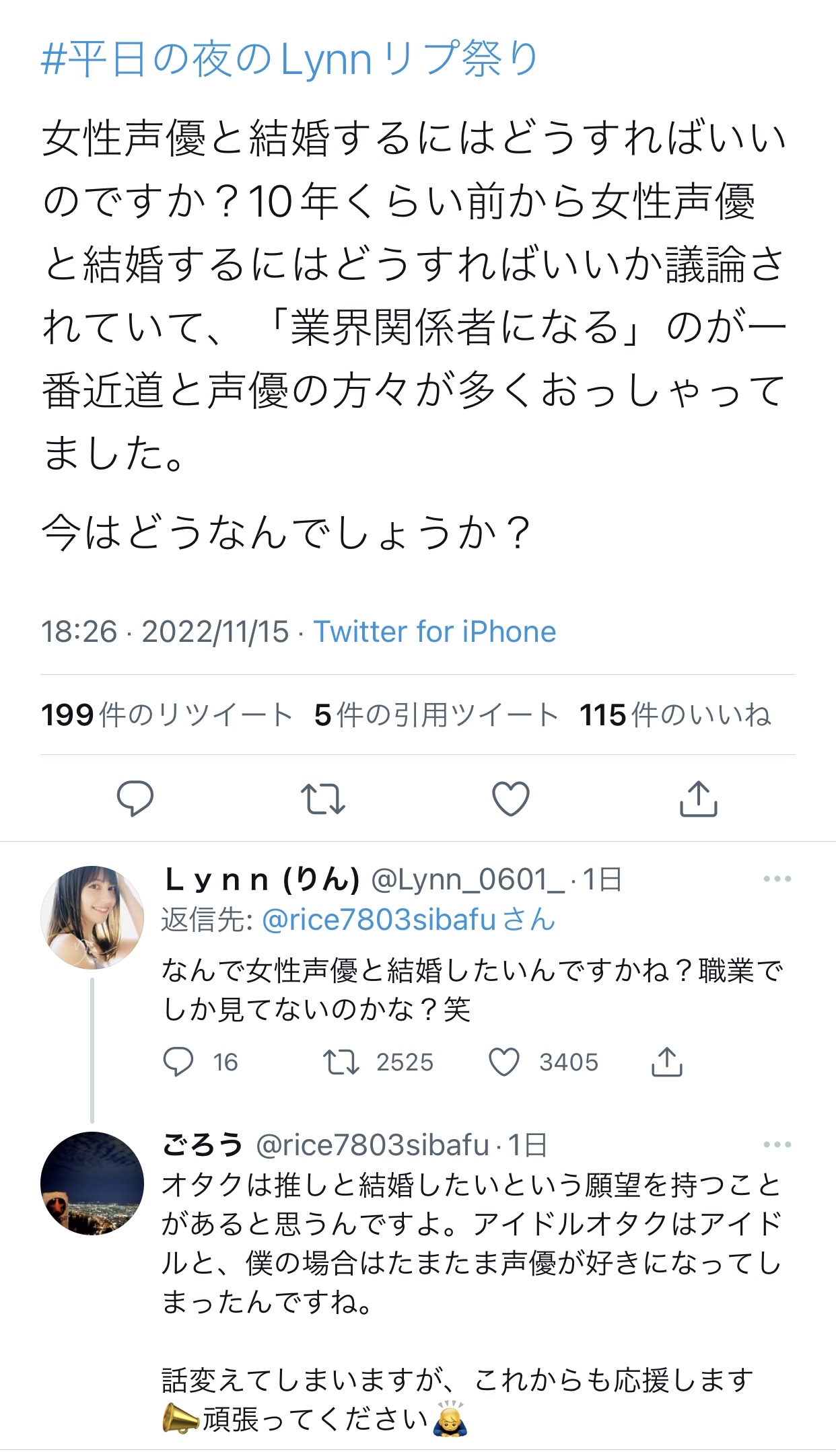 人気声優のLynnさん、女性声優と結婚したい声豚を一刀両断してしまうwwwww Twitter Facebook はてブ LINE コピー 2022.11.17 スポンサーリンク 1: それでも動く名無し 2022/11/17(木) 15:46:11.47 ID:xo0q/sql0 切れ味よくて草 なんで女性声優と結婚したいんですかね?職業でしか見てないのかな?笑— Lynn (りん) (@Lynn_0601_) November 15, 2022 3: それでも動く名無し 2022/11/17(木) 15:47:36.36 ID:YF2cQjZSd 会心の一撃やな 4: それでも動く名無し 2022/11/17(木) 15:48:29.25 ID:3xf3h+X80 しゃーない 切り替えていけ 続きを読む