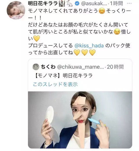 【画像】明日花キララさん、Twitterで自分のものまねした女のTweetに効いてしまうwwwwwwwwwww Twitter Facebook はてブ LINE コピー 2022.11.19 スポンサーリンク 1:風吹けば名無し:2022/11/19(土) 15:47:04.48 ID:yppTHAnR0.net 2:風吹けば名無し:2022/11/19(土) 15:48:03.27 ID:u74ZQDEi0.net 最初から無視して事務所に丸投げしてれば良かったのに 3:風吹けば名無し:2022/11/19(土) 15:48:08.52 ID:Pc8PK4O1a.net ちくわより明日花のが誹謗中傷してね? 続きを読む