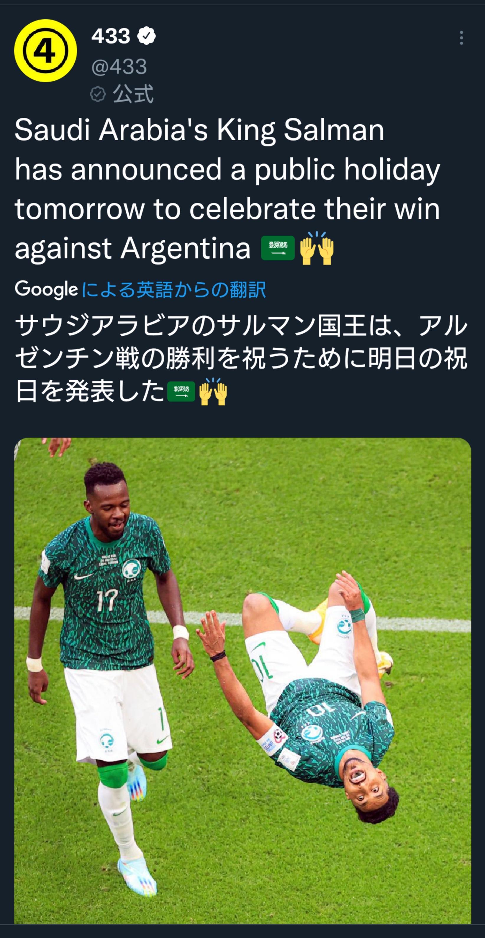 🚨情報によるとサウジアラビア🇸🇦の国王がワールドカップでアルゼンチンに勝利したサウジアラビアを国民が祝うため、明日を祝日にすると発表🔥