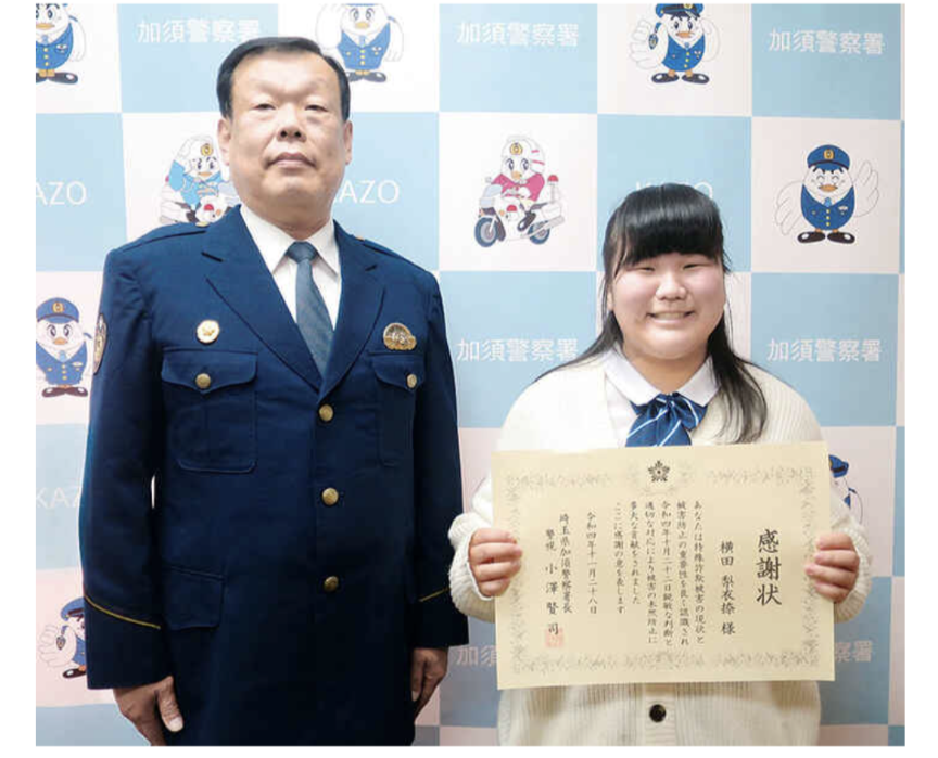 緊張の通報に称賛埼玉県警加須署(小沢賢司署長)は28日、特殊詐欺被害を未然防止した功労で、コンビニエンスストア・ファミリーマート豊野台テクノタウン店のアルバイト店員、県立羽生高校2年の横田梨衣捺(りいな)さん(17)に同署で感謝状を贈った。 同署によると、横田さんは10月22日午後5時ごろ、店に訪れた60代男性が5万円で電子マネーを購入しようとしたことから特殊詐欺を疑った。購入理由を確認したところ、「パソコンがウイルスにかかって、セキュリティーをするためにギフトカードが必要」と言ったことから、詐欺だと直感した。 電子マネーの購入をやめさせ、同署に「特殊詐欺かもしれない。来てください」と通報。被害を未然に防いだ。