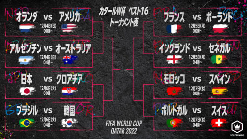 決勝トーナメント進出国の内訳は、欧州が最多8カ国(オランダ、フランス、ポーランド、イングランド、クロアチア、スペイン、スイス、ポルトガル)、次いでアジアが3カ国(オーストラリア、日本、韓国)、南米(アルゼンチン、ブラジル)とアフリカ(セネガル、モロッコ)が2カ国、北中米カリブ海(アメリカ)が1カ国となっている。今後の対戦日程と放送予定は以下の通り。