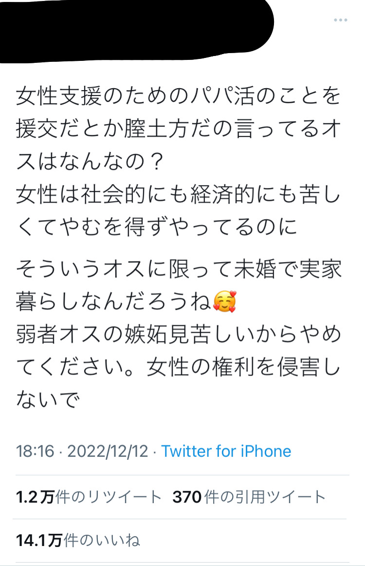 【画像】マンさん「女性支援のためのパパ活をバカにしてる人、馬鹿です」⇽14万いいねの大反響wwww Twitter Facebook はてブ LINE コピー 2022.12.15 スポンサーリンク 2:以下、?ちゃんねるからVIPがお送りします:2022/12/14(水) 16:48:24.032 4:以下、?ちゃんねるからVIPがお送りします:2022/12/14(水) 16:49:02.326 >>2 やばすぎやろ…… 8:以下、?ちゃんねるからVIPがお送りします:2022/12/14(水) 16:50:07.390 肉便器がしゃべった!? 続きを読む