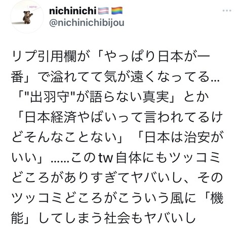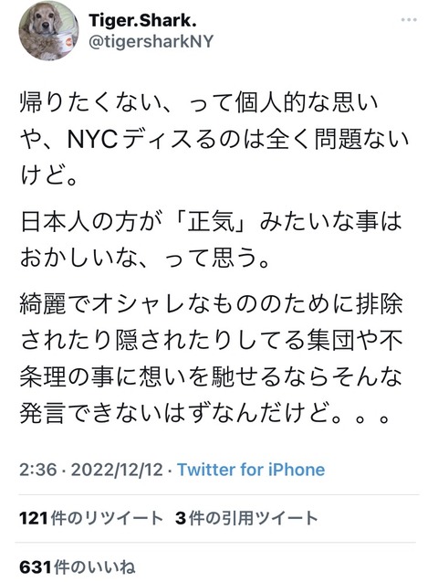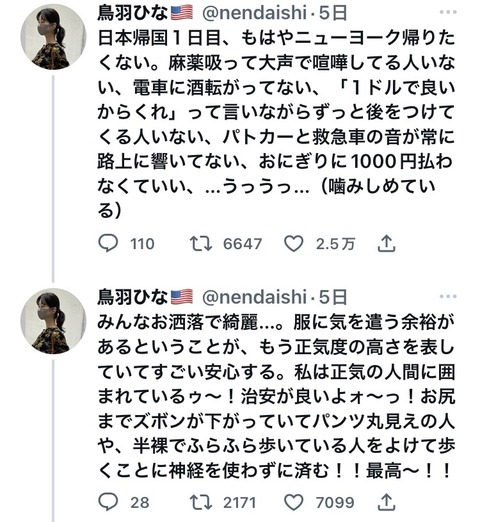 【悲報】NY在住の女さん、帰国中にアメリカに戻りたくないと愚痴ってしまいクッソ叩かれてしまう Twitter Facebook はてブ LINE コピー 2022.12.16 スポンサーリンク 1:風吹けば名無し:2022/12/15(木) 21:09:04.89 女「ニューヨーク治安悪いし服汚い奴多いし物価高いし最悪!戻りたくない」 敵「差別差別差別差別ゥ!!!!」 ↓ 3:風吹けば名無し:2022/12/15(木) 21:10:33.98 なんでそんなに日本がよく書かれることが嫌なんやろか 続きを読む