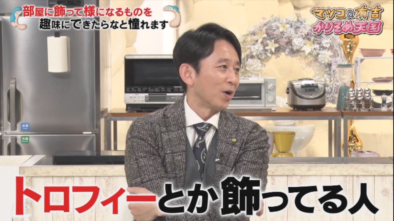 「どんなインテリアにも合う、おしゃれな家にも合うのよ」と赤べこを猛アピールするマツコに対し、有吉は思い出したように「俺ね…あれがいつも嫌なんだよな、トロフィーとか飾っている人」と吐露しはじめる。