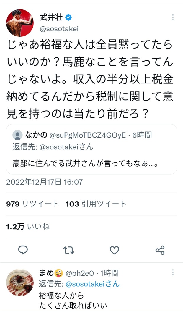 じゃあ裕福な人は全員黙ってたらいいのか?馬鹿なことを言ってんじゃないよ。収入の半分以上税金納めてるんだから税制に関して意見を持つのは当たり前だろ? https://t.co/gPaSq0a6BC