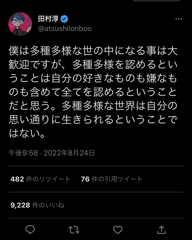 【速報】大物芸人「多様性を認めるというのは嫌いな物も全て認めるという事」 Twitter Facebook はてブ LINE コピー 2022.12.18 スポンサーリンク 1 : それでも動く名無し :2022/12/18(日) 11:37:58.77 ID:tiDNlOwxd確かにな2 : それでも動く名無し :2022/12/18(日) 11:38:08.53 ID:tiDNlOwxd頭良いわ転載元スレッド:https://nova.5ch.net/test/read.cgi/livegalileo/1671331078/ 続きを読む