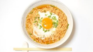 途中から浮かせておいた半熟卵を割って絡めて食べる
