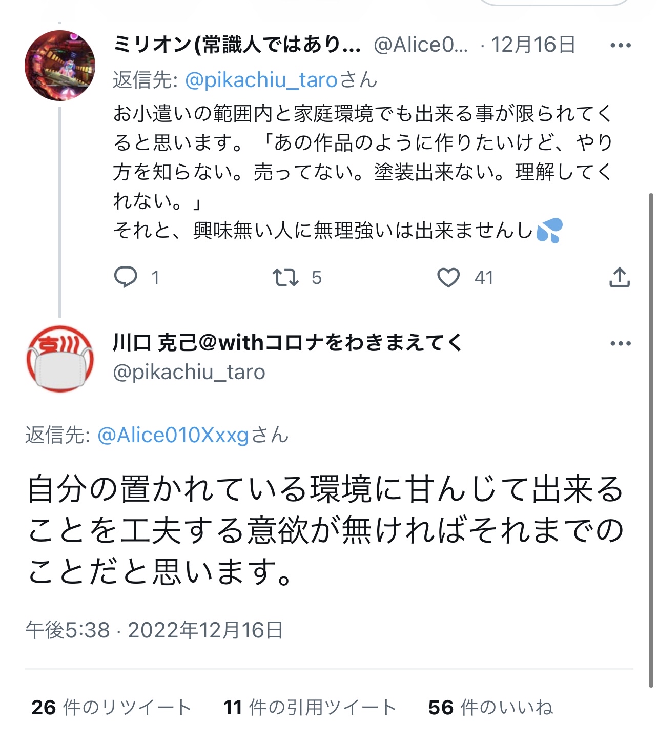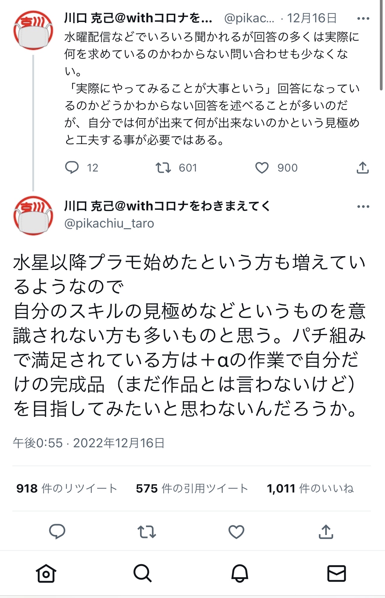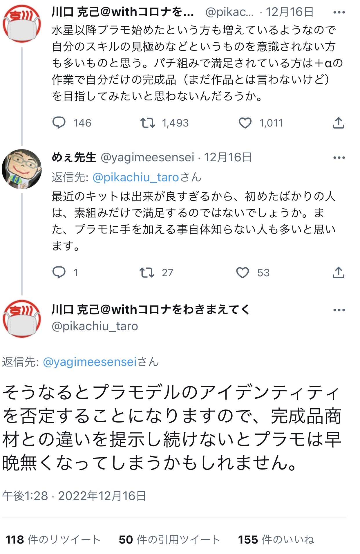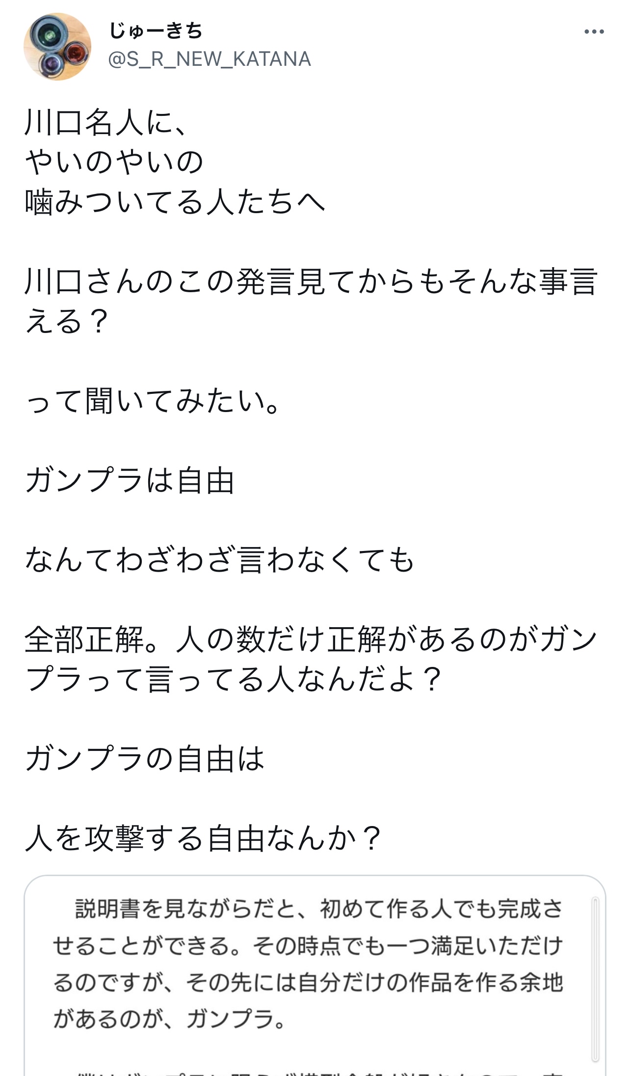 ガンプラ界の神、川口名人の炎上発言未だ燃え続ける Twitter Facebook はてブ LINE コピー 2022.12.19 スポンサーリンク 1: それでも動く名無し 2022/12/19(月) 12:55:40.54 ID:WStYYlaGp 塗装もなにもしないガンプラなんて意味あるの?と発言される ↓ 貧困層のおっちゃんとガキが図星突かれてブチ切れ発狂 ↓ プロモデラーさん達が続々参戦して擁護レスバ開始 ↓ おもちゃ業界を巻き込んで論争中 2: それでも動く名無し 2022/12/19(月) 12:56:19.43 ID:WStYYlaGp 文句言うやつに対して文句を言う連中だらけで収拾がつかん模様 7: それでも動く名無し(茸) 2022/12/19(月) 12:58:02.68 ID:Qf8v1M/pd >>2 なんかブーメラン刺さりそうな反論やね🤔 続きを読む