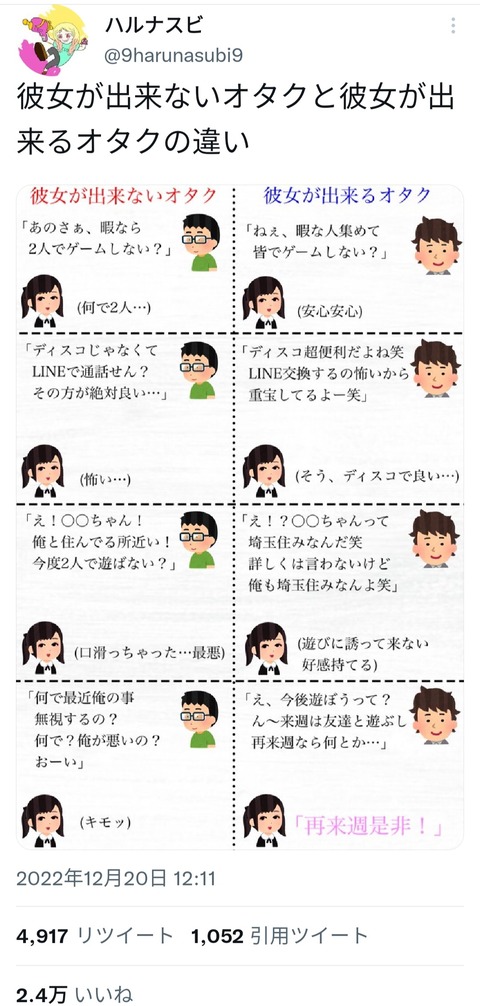 【画像】彼女が出来る陰と出来ない陰の違いがコチラwwwwwwwwww Twitter Facebook はてブ LINE コピー 2022.12.22 スポンサーリンク 1:以下、5ちゃんねるからVIPがお送りします:2022/12/22(木) 12:08:02.068 ID:oPjzf2LTd 3:以下、5ちゃんねるからVIPがお送りします:2022/12/22(木) 12:10:20.646 ID:fzX7H1890 これ逆じゃん お前らは右のこと言って彼女できないタイプだろ 左はただキモいだけw 続きを読む