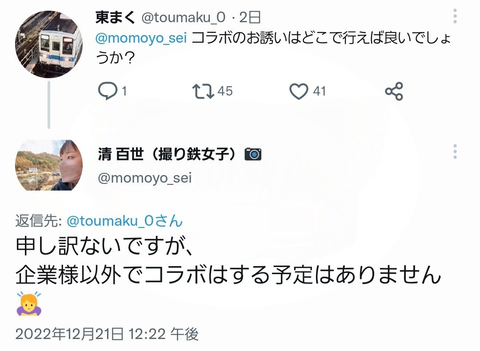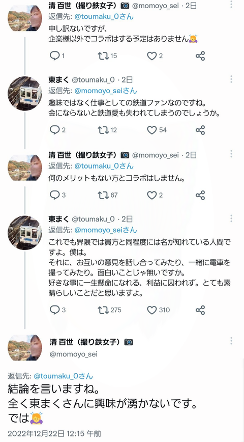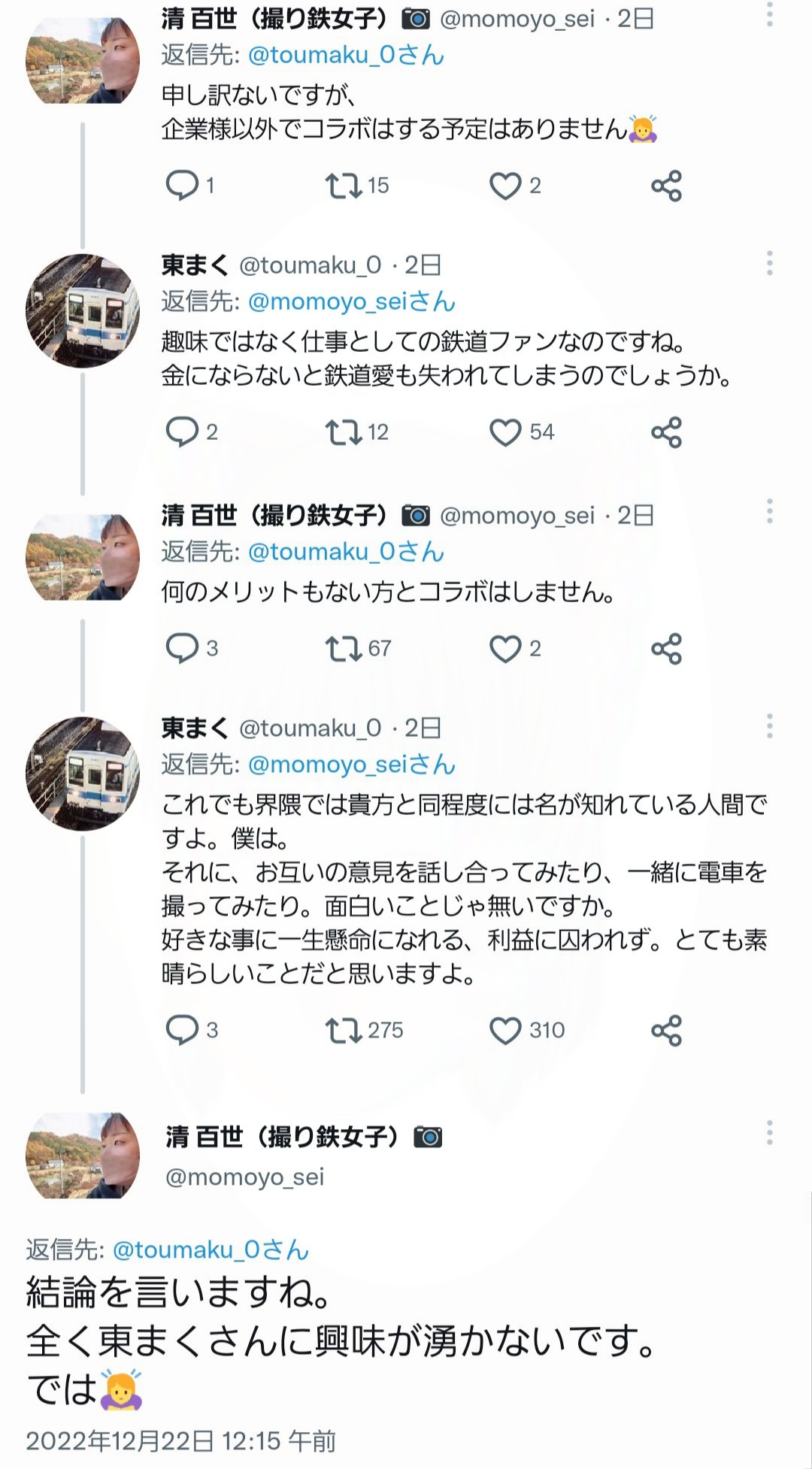 【悲報】 撮り鉄、勇気を出して撮り鉄女子にコラボを依頼するも無事フラれる Twitter Facebook はてブ LINE コピー 2022.12.23 スポンサーリンク 1::2022/12/23(金) 16:00:35.38 ID:5yAbeEfa0 BE:472567884-2BP(2000) 2::2022/12/23(金) 16:00:57.06 ID:.net これはこの女が糞 114:水星(茸) [ニダ]:2022/12/23(金) 16:22:25.34 >>2 普通に気持ち悪いしそりゃ断わるだろ 195:水星(茸) [US]:2022/12/23(金) 16:40:12.08 >>2 シュポーって言ってみて シュポーって 312::2022/12/23(金) 17:24:34.78 ID:7R0bYs5U0.net >>2 撮り鉄ジジイちーっす! 続きを読む